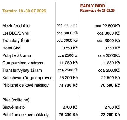 - Poplatek za gurupurnimový program 11 250 Kč (450 €) (včetně 5 nocí a 3 vegetariánských jídel denně), platba ášramu přímo na místě v hotovosti.